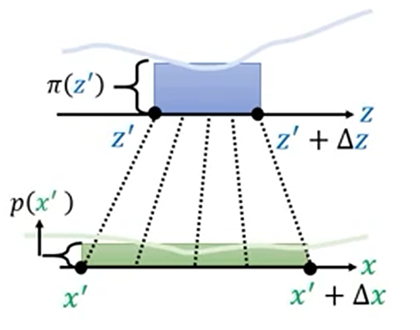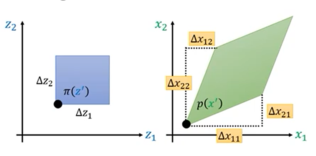 $$ p(x') \left| \det \begin{bmatrix} \Delta x_{11} & \Delta x_{21} \\ \Delta x_{12} & \Delta x_{22}\end{bmatrix} \right| = \pi(z') \Delta z_{1} \Delta z_{2} $$$$ p(x')=\pi (z')\left|\det J_{f^{-1}} \right| $$