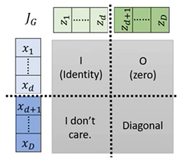 对于第一个部分,易知其为单位矩阵,$z$的第二部分和第一部分无关,所以为零矩阵,此时整个函数的 Jabobian 矩阵只与右下角这一部分有关,右下角部分逐个求偏导就是$\beta$的值,故整个函数的 Jabobian 矩阵可写作如下形式: